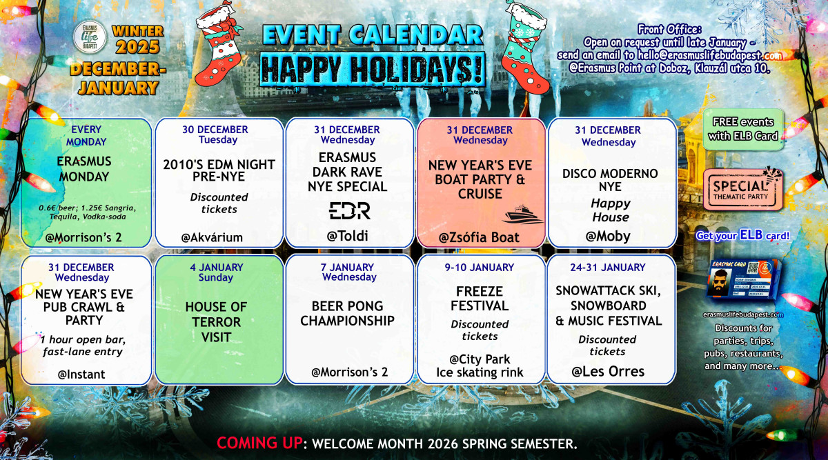 Follow us on instagram.com/erasmuslifebudapest/ and facebook.com/ErasmusLifeBudapest to stay up-to-date!