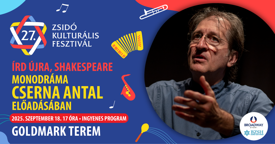 Vajon antiszemita-e Shakespeare világhírű színműve, A velencei kalmár, amelyet évszázadok óta játszanak szerte a világon? 2025. szeptember 18-án, csütörtök este 7 órakor a Goldmark-teremben Lackó Gábor, a monodráma szerzője szellemes ajánlatot tesz az angol drámaírónak: hogyan kellene A velencei kalmárt közösen átírniuk ahhoz, hogy a mű megszabaduljon az antiszemitizmus – talán félreértésből rátapadt – vádjától. A programon a részvétel ingyenes. Az ülőhelyek elfoglalása érkezés szerint.