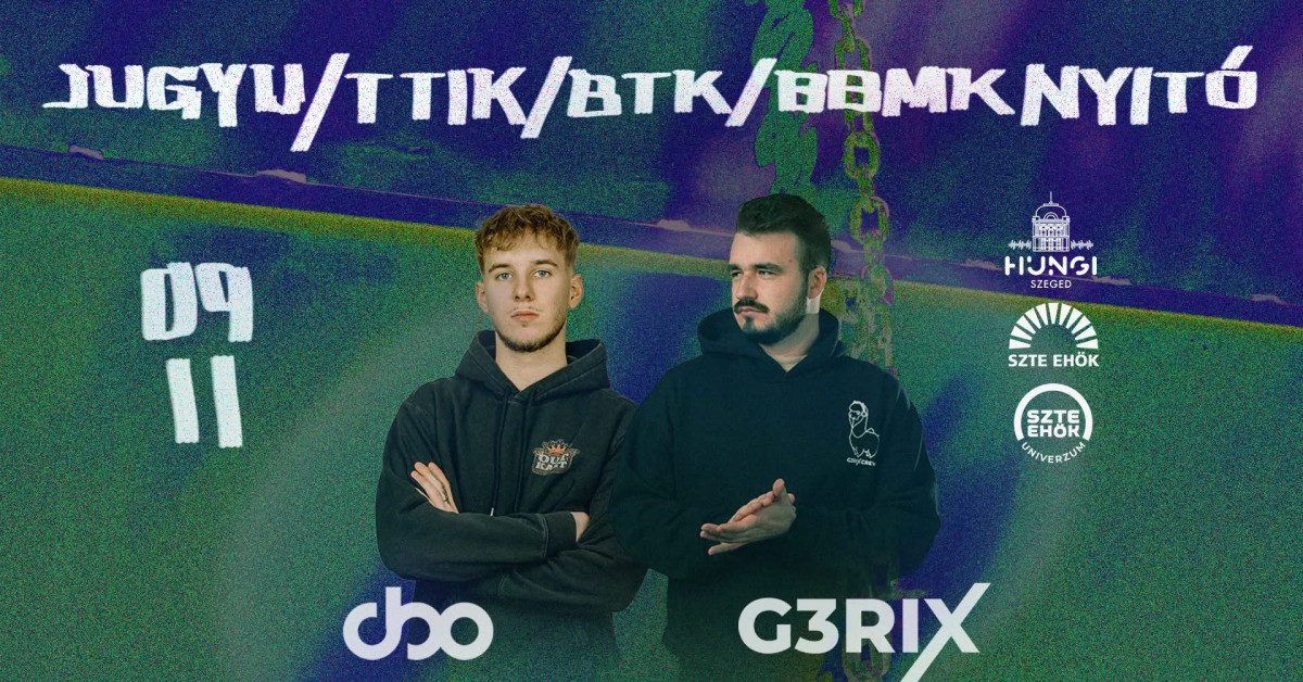 Az SZTE EHÖK Univerzum bemutatja: JUGYU/TTIK/BTK/BBMK NYITÓ 📅 Dátum: 2025. Szeptember 11., Csütörtök 📍 Helyszín: Hungi 🎤 Fellépők - G3RIX - ABO