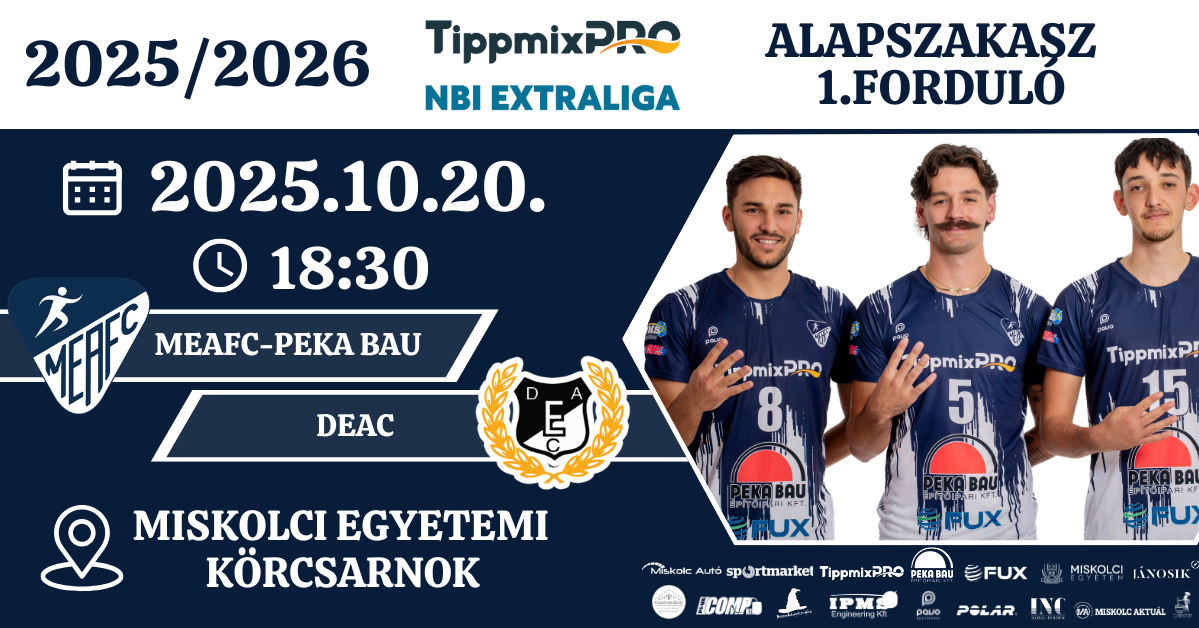 MEAFC-Peka Bau vs. DEAC TippmixPro NBI Extraliga 1.forduló Kapunyitás: 17:30 Meccskezdés: 18:30