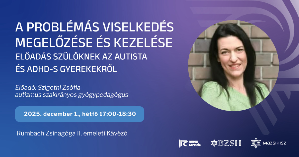A problémás viselkedés megelőzése és kezelése – Szigethi Zsófia előadása 2025. december 1-én, hétfőn 17 órától a Rumbach zsinagógában.