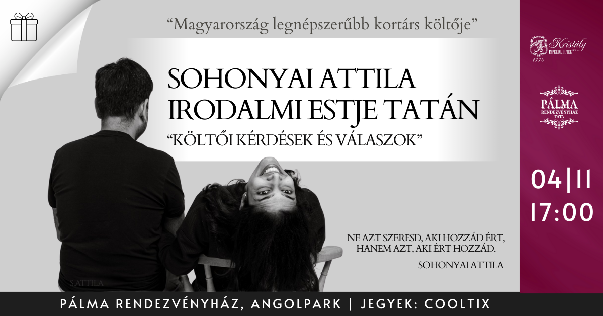 Különleges programot ajánlunk az irodalom szerelmeseinek - ezúttal Magyarország legnépszerűbb kortárs költőjének irodalmi estjére invitálunk Tatán.