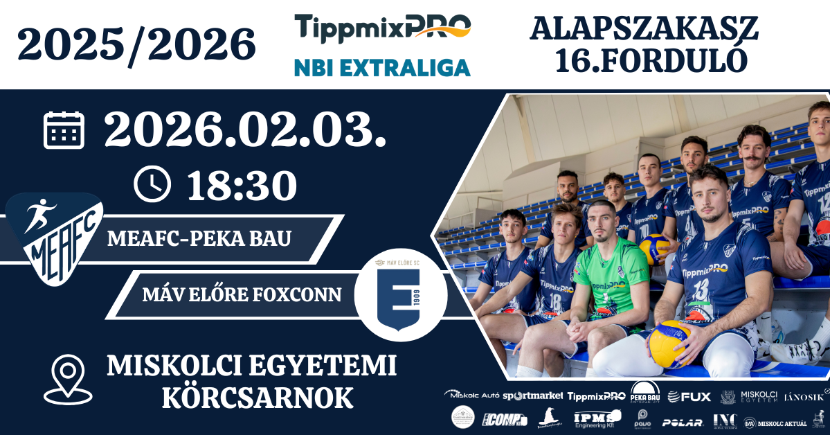 Férfi Röplabda TippmixPro NBI Extraliga 16.forduló MEAFC-Peka Bau - MÁV Előre Foxconn Kapunyitás: 17:30 Mérkőzés kezdete: 18:30