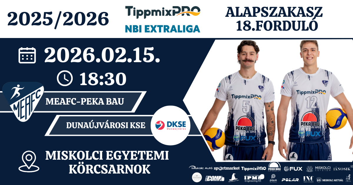 Férfi Röplabda TippmixPro NBI Extraliga 18.forduló MEAFC-Peka Bau - Dunaújvárosi KSE Kapunyitás: 17:30 Mérkőzés kezdete: 18:30