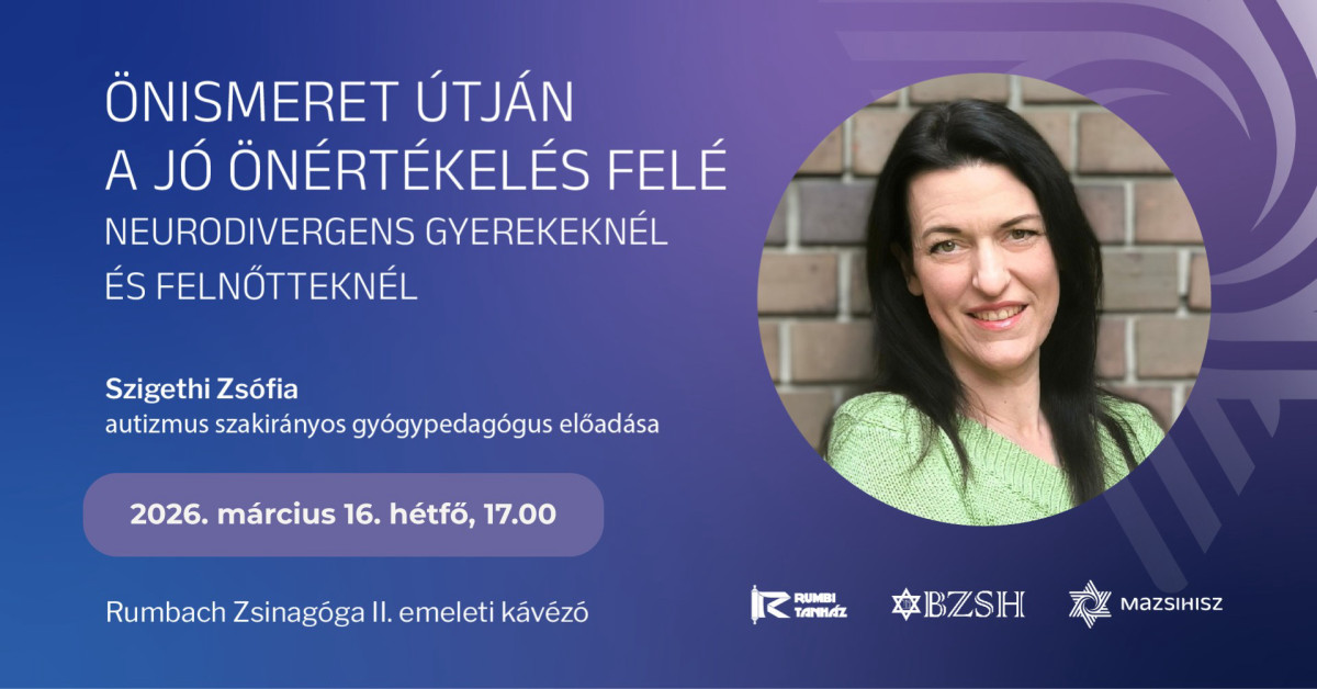 A Rumbach utcai zsinagóga kávézójában 2026. március 16-án, hétfőn 17.00 órakor folytatódik a Rumbi Tanház nagy sikerű előadássorozata. Ezúttal Szigethi Zsófia autizmus szakirányos gyógypedagógussal azt a kérdést járjuk körül, mit jelent a mindennapokban neurodivergensnek lenni, és hogyan támogatható az önismeret és a pozitív önértékelés neurodivergens gyerekek és felnőttek esetében.