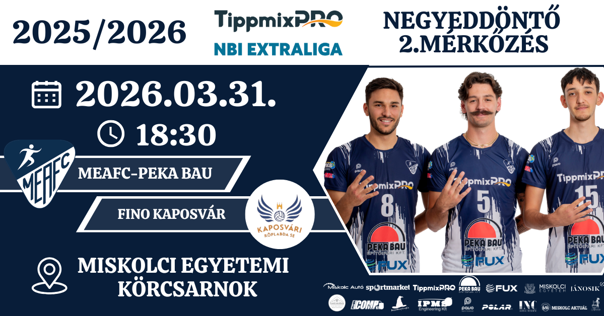 Férfi Röplabda TippmixPro NBI Extraliga Negyeddöntő 2.mérkőzés MEAFC-Peka Bau - Fino Kaposvár Kapunyitás: 17:30 Mérkőzés kezdete: 18:30