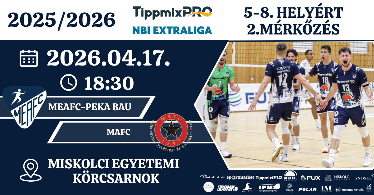 Férfi Röplabda TippmixPro NBI Extraliga 5-8. helyért 2.mérkőzés MEAFC-Peka Bau - MAFC Kapunyitás: 17:00 Mérkőzés kezdete: 18:00