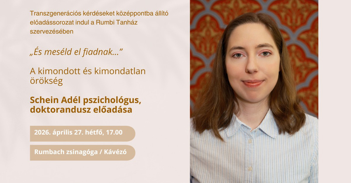 2026. április 27-én, hétfőn délután 5 órakor indul az „És meséld el fiadnak…” című előadássorozat első alkalma: A kimondott és kimondatlan örökség címmel. Az est előadója Schein Adél pszichológus, doktorandusz, a program helyszíne a Rumbach zsinagóga kávézó.